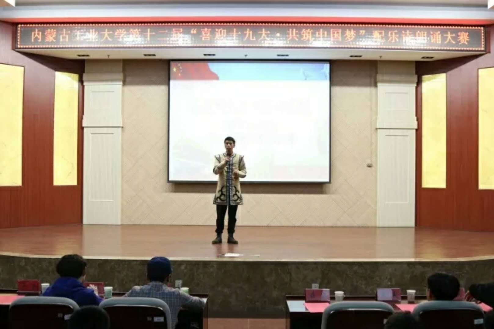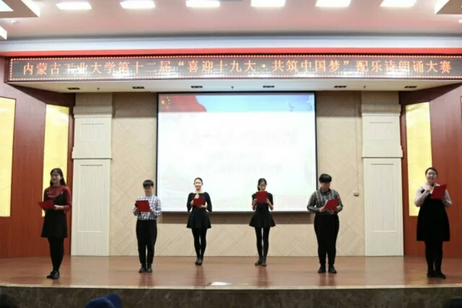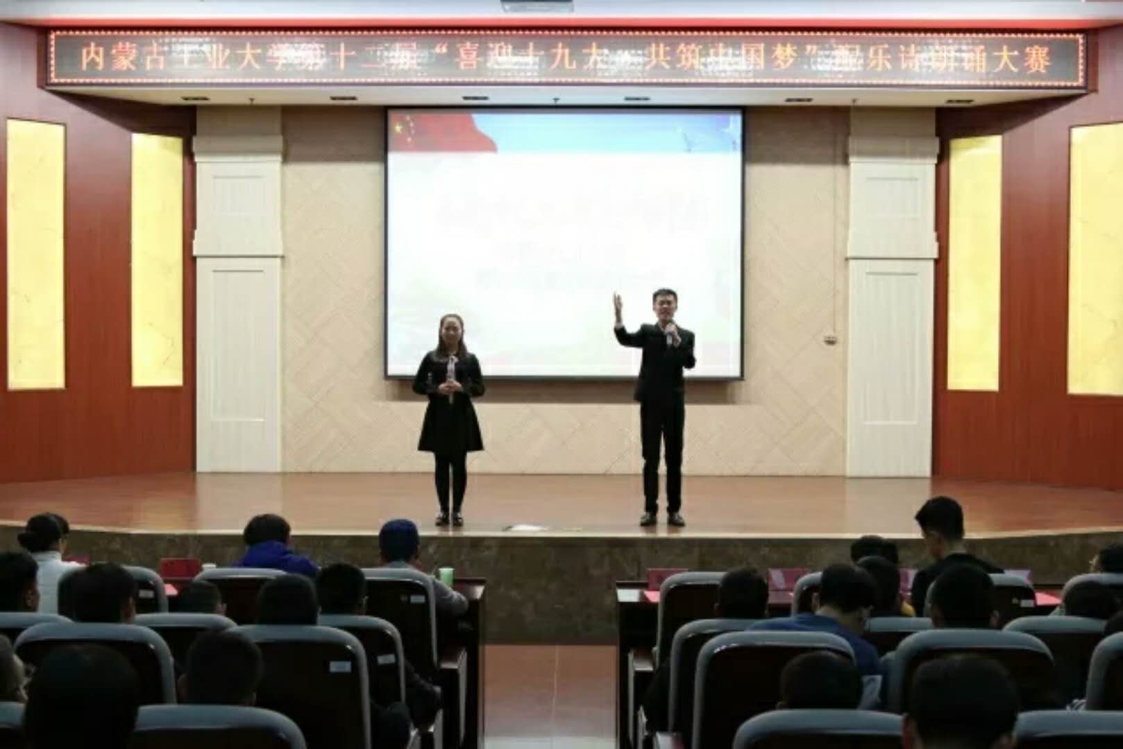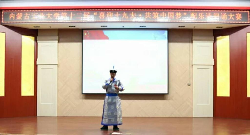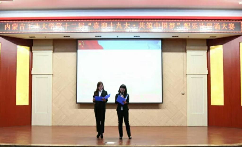 为庆祝党的十九大的胜利召开,积极贯彻党的十九大精神,深入学习习近平总书记的重要讲话,我院于2017年12月5日晚7点,在电力大楼十楼报告厅成功举办了内蒙古工业大学第十二届“喜迎十九大,共筑中国梦”配乐诗朗颂大赛决赛。
